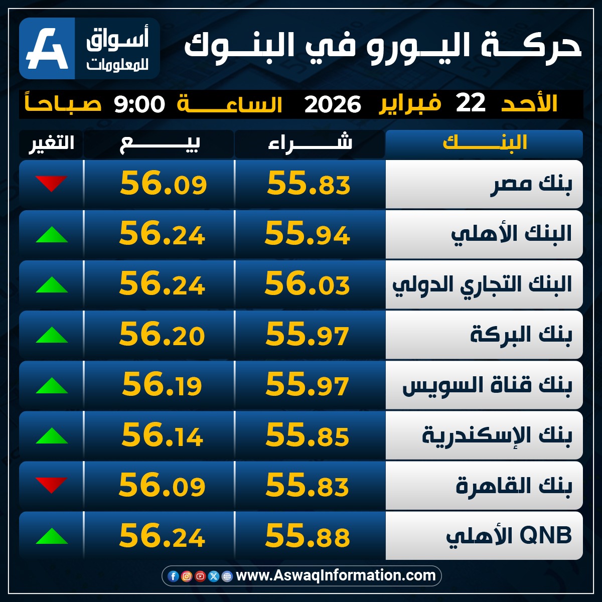 وزاد سعر اليورو في البنك عند 55.97 جنيه للشراء، وسعر 56.20 جنيه للبيع