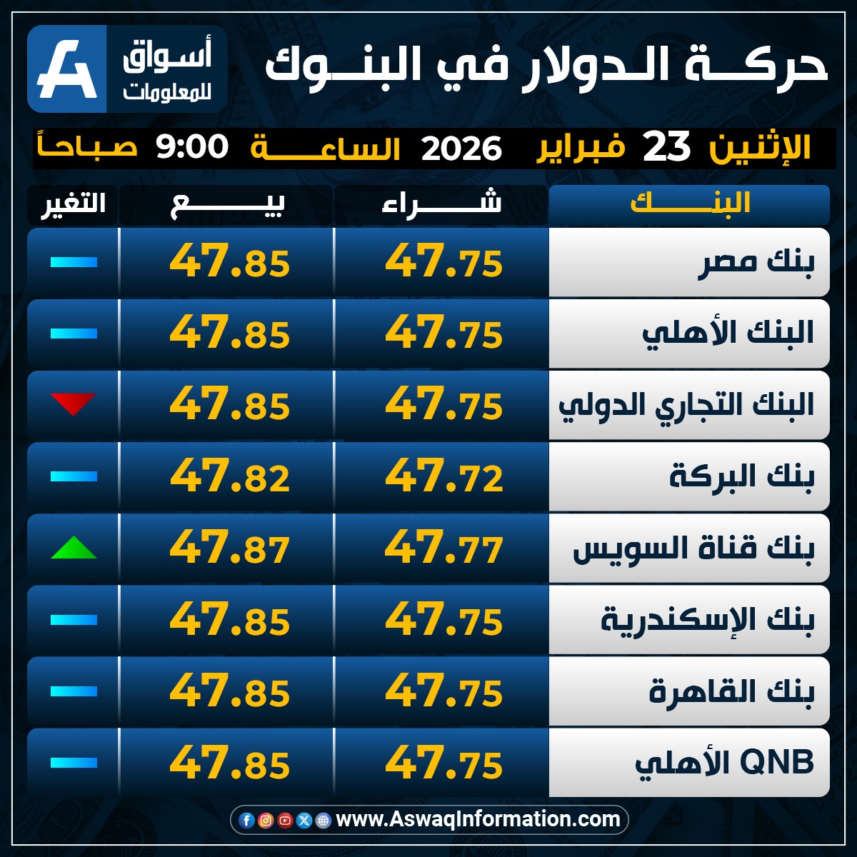 في حين تراجع سعر الدولار في البنك التجاري الدولي مقابل الجنيه المصري عند 47.75 جنيه للشراء، ونحو 47.85 جنيه للبيع.
