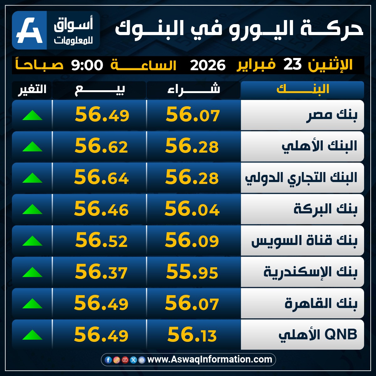 وصعد سعر اليورو في البنك الأهلي المصري نحو 56.28 جنيه للشراء، وسعر 56.62 جنيه للبيع