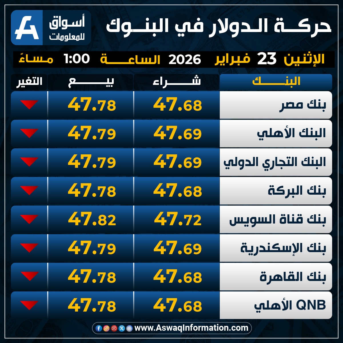 وهبط سعر الدولار في البنك الأهلي المصري مقابل الجنيه المصري عند 47.69 جنيه للشراء، ونحو 47.79 جنيه للبيع.