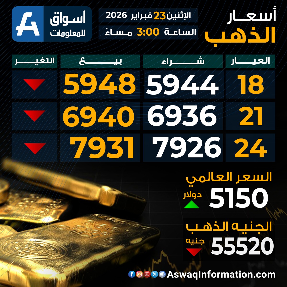 سعر الذهب في مصر الإثنني 23 فبراير 2026