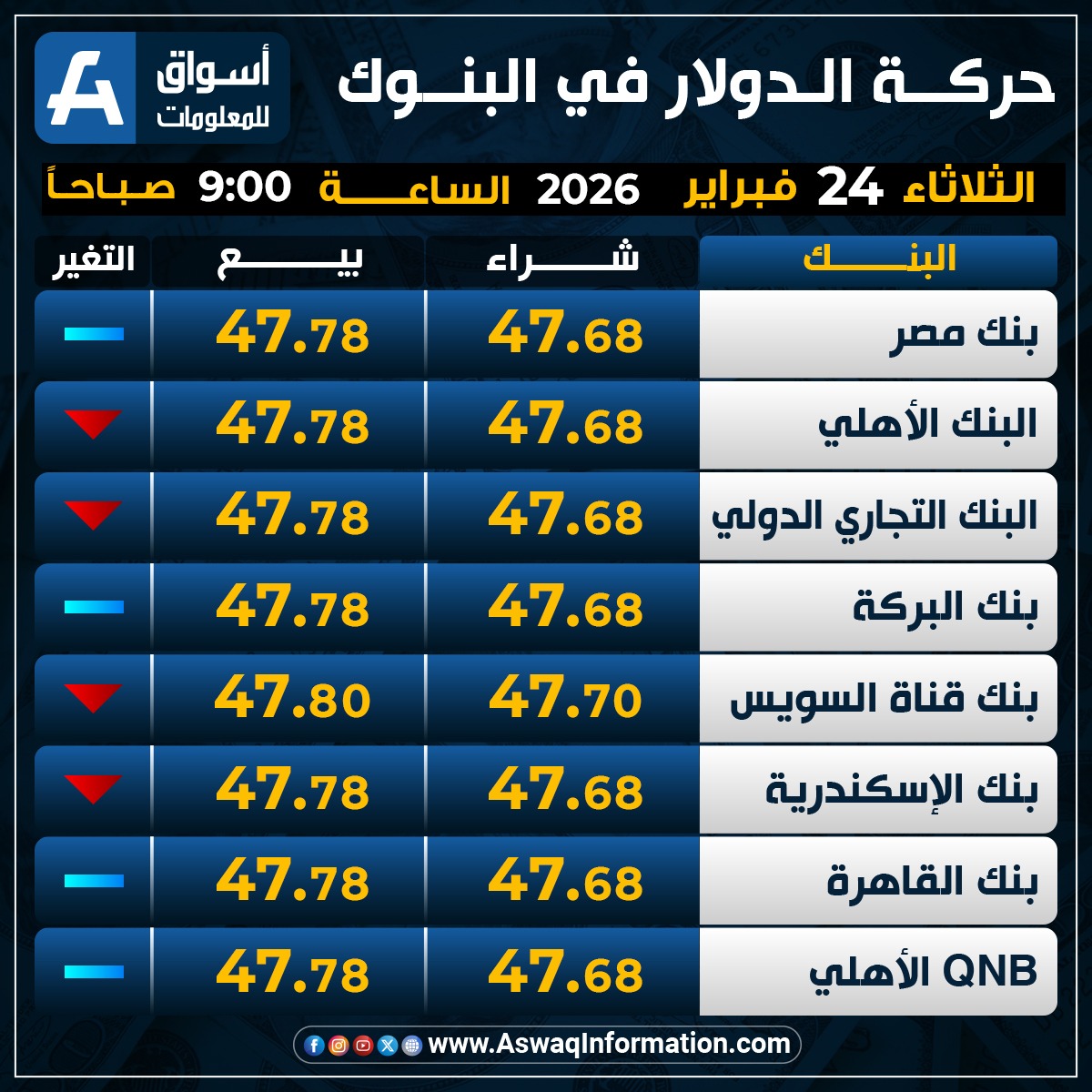 في حين نزل سعر الدولار في البنك الأهلي المصري مقابل الجنيه المصري عند 47.68 جنيه للشراء، ونحو 47.78 جنيه للبيع.