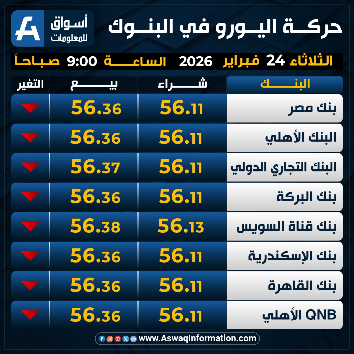 وهبط سعر اليورو في البنك الأهلي المصري نحو 56.11 جنيه للشراء، وسعر 56.36 جنيه للبيع