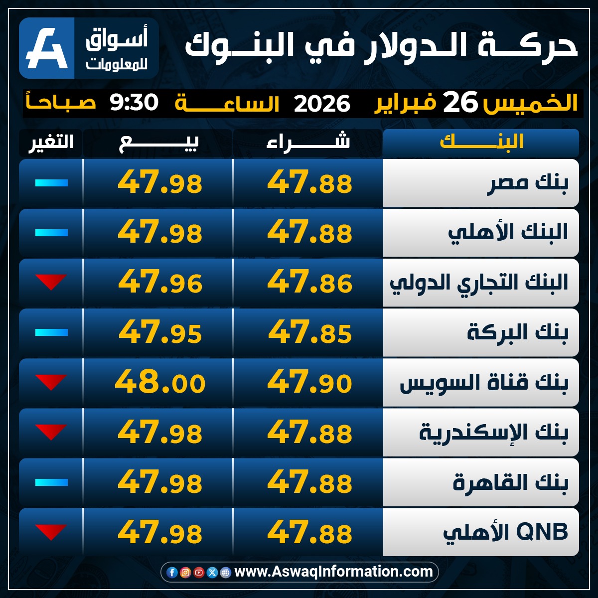 سعر الدولار اليوم.. ننشر لكم التفاصيل التي طرأت على العملة الخضراء التي شهدت تباينًا بمستهل تعاملات اليوم الخميس 26 فبراير 2026 مقابل الجنيه، وذلك بحسب شاشات التداول المعلنة بالبنوك الحكومية والخاصة العاملة داخل السوق المصرفية.
