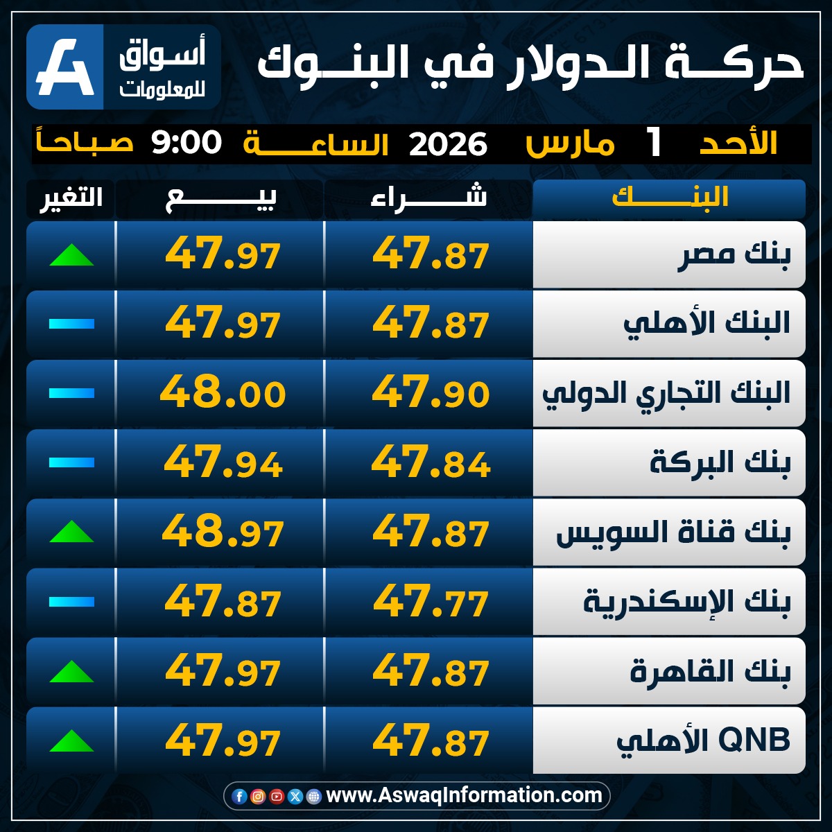 سعر الدولار اليوم.. ننشر لكم التفاصيل التي طرأت على العملة الخضراء التي شهدت تباينًا بمستهل تعاملات اليوم الأحد 1 مارس 2026 مقابل الجنيه، وذلك بحسب شاشات التداول المعلنة بالبنوك الحكومية والخاصة العاملة داخل السوق المصرفية.