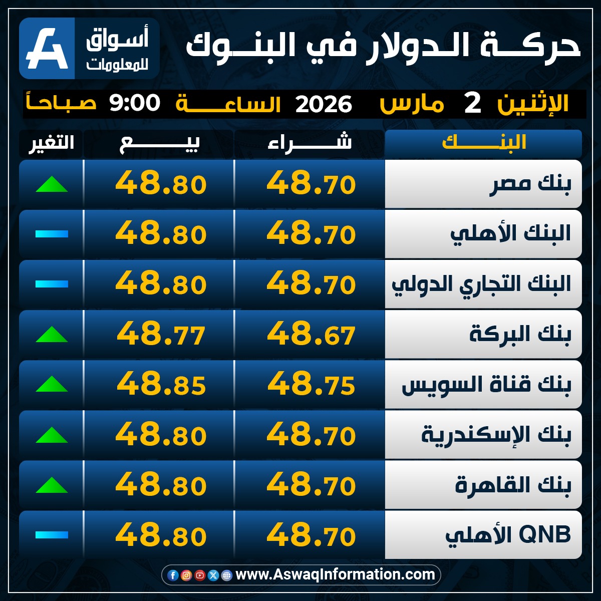 بينما ثبت سعر الدولار في بنك QNB الأهلي مقابل الجنيه المصري عند 48.70 جنيه للشراء، ونحو 48.80 جنيه للبيع.