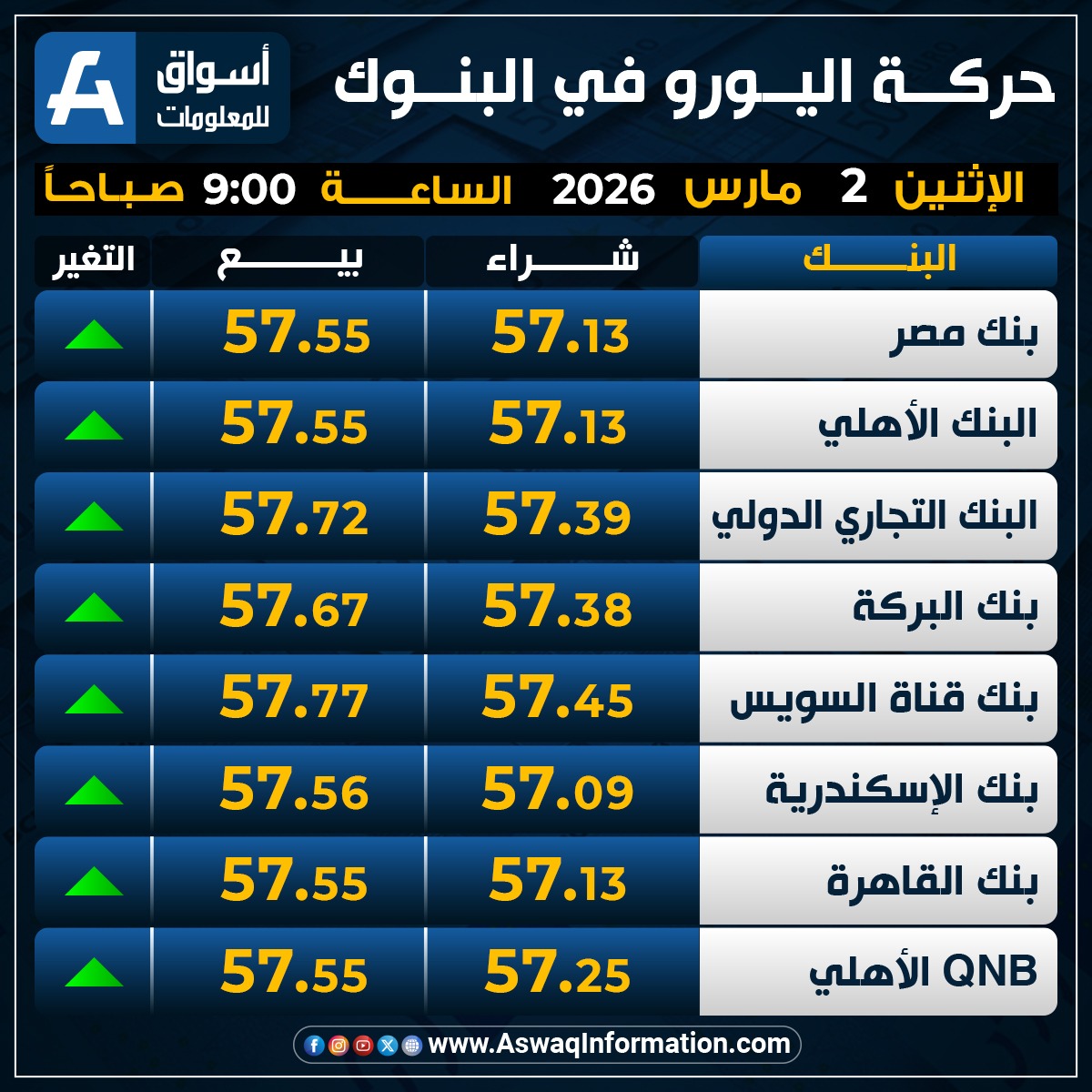 وصعد سعر اليورو في البنك الأهلي المصري نحو 57.13 جنيه للشراء، وسعر 57.55 جنيه للبيع