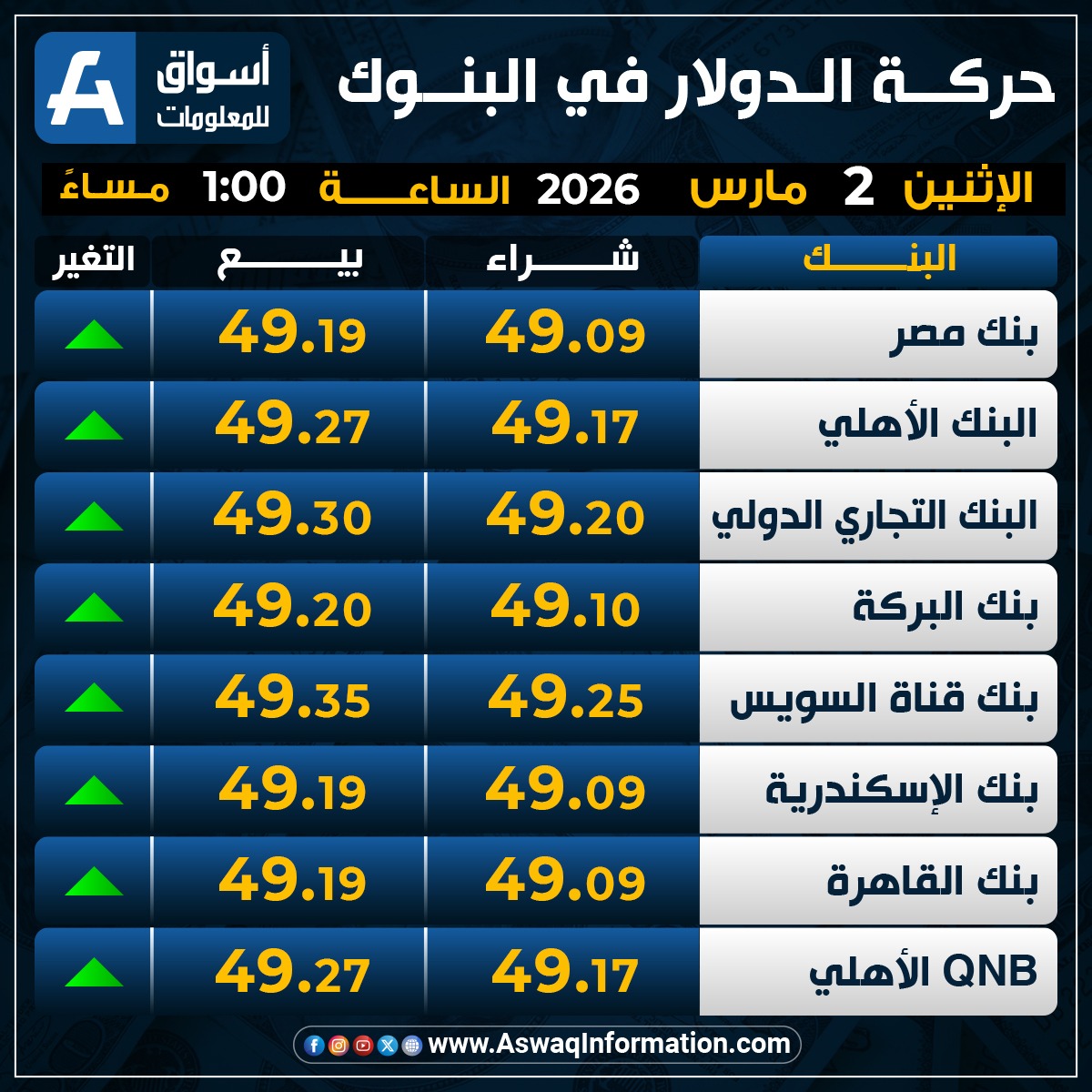 سعر الدولار اليوم.. ننشر لكم التفاصيل التي طرأت على العملة الخضراء التي شهدت ارتفاعا بمنتصف تعاملات اليوم الإثنين 2 مارس 2026 مقابل الجنيه، وذلك بحسب شاشات التداول المعلنة بالبنوك الحكومية والخاصة العاملة داخل السوق المصرفية.