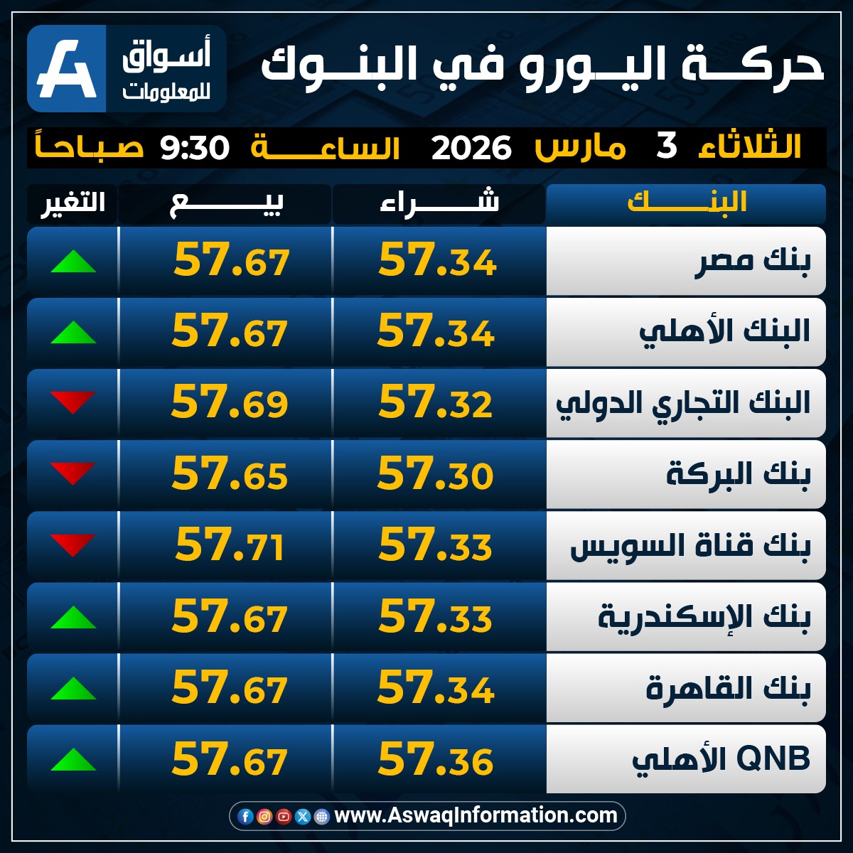 بينما قفز بنك الإسكندرية، سجل سعر اليورو نحو 57.33 جنيه للشراء، وسعر 57.67 جنيه للبيع