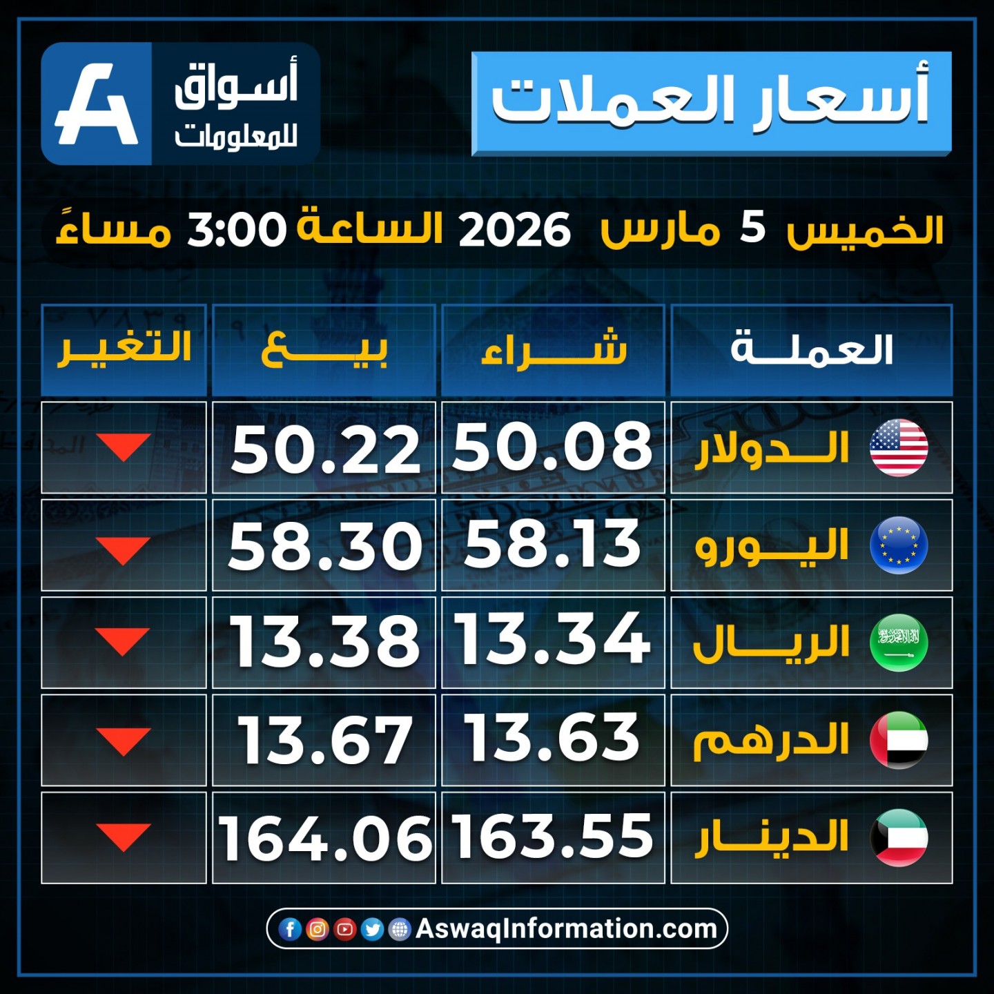 خيم التراجع على أسعار العملات اليوم الخميس 5 مارس 2026، مقابل الجنيه في نهاية التعاملات.