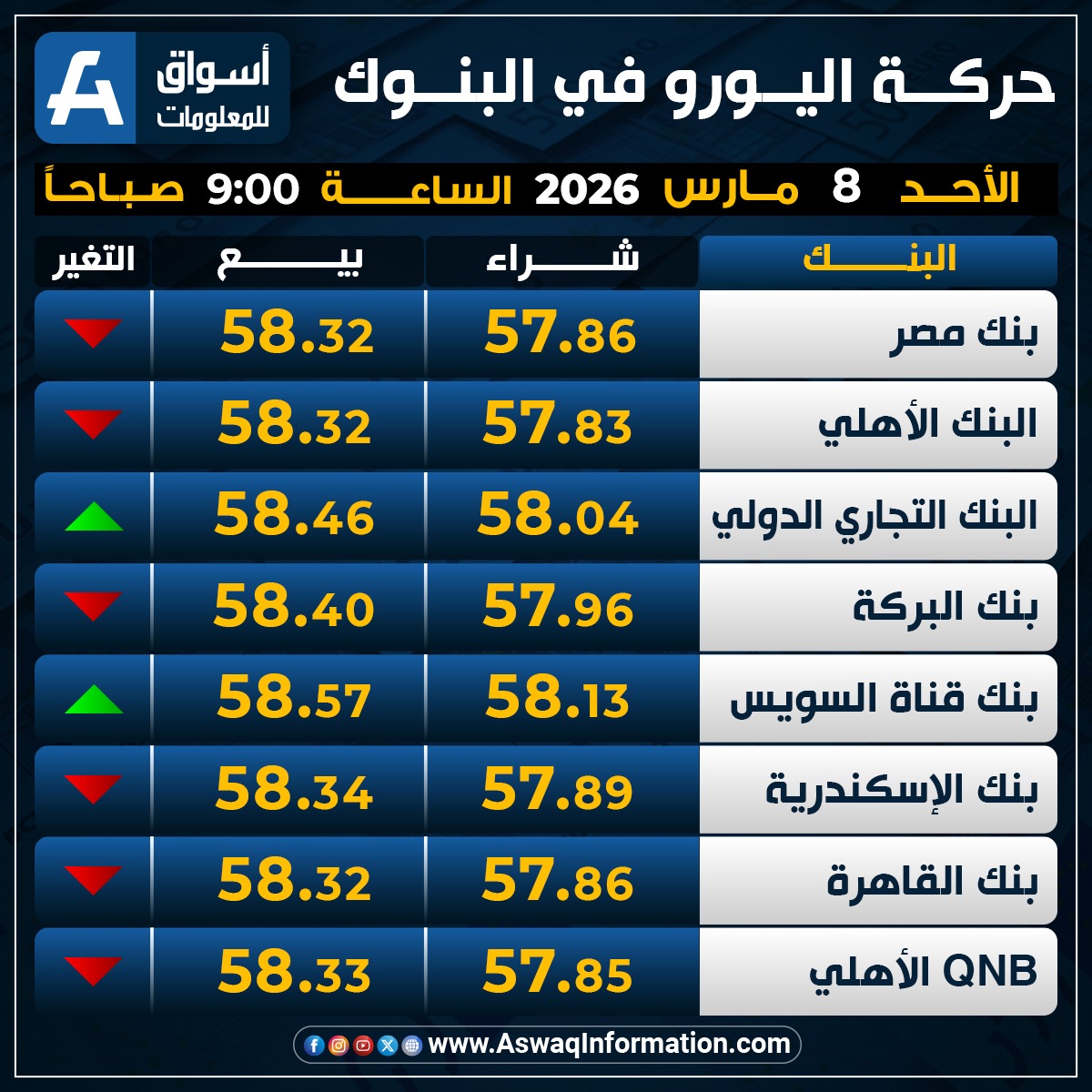 ونزل سعر اليورو في البنك عند 57.96 جنيه للشراء، وسعر 58.40 جنيه للبيع
