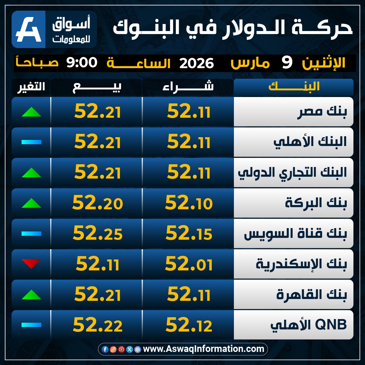 في حين ثبت سعر الدولار في البنك الأهلي المصري مقابل الجنيه المصري عند 52.11 جنيه للشراء، ونحو 52.21 جنيه للبيع.