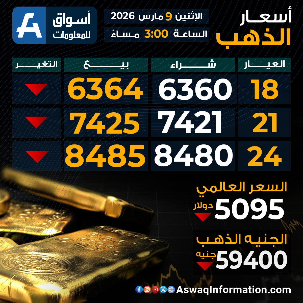 سعر الذهب في مصر الإثنين 9 مارس 2026