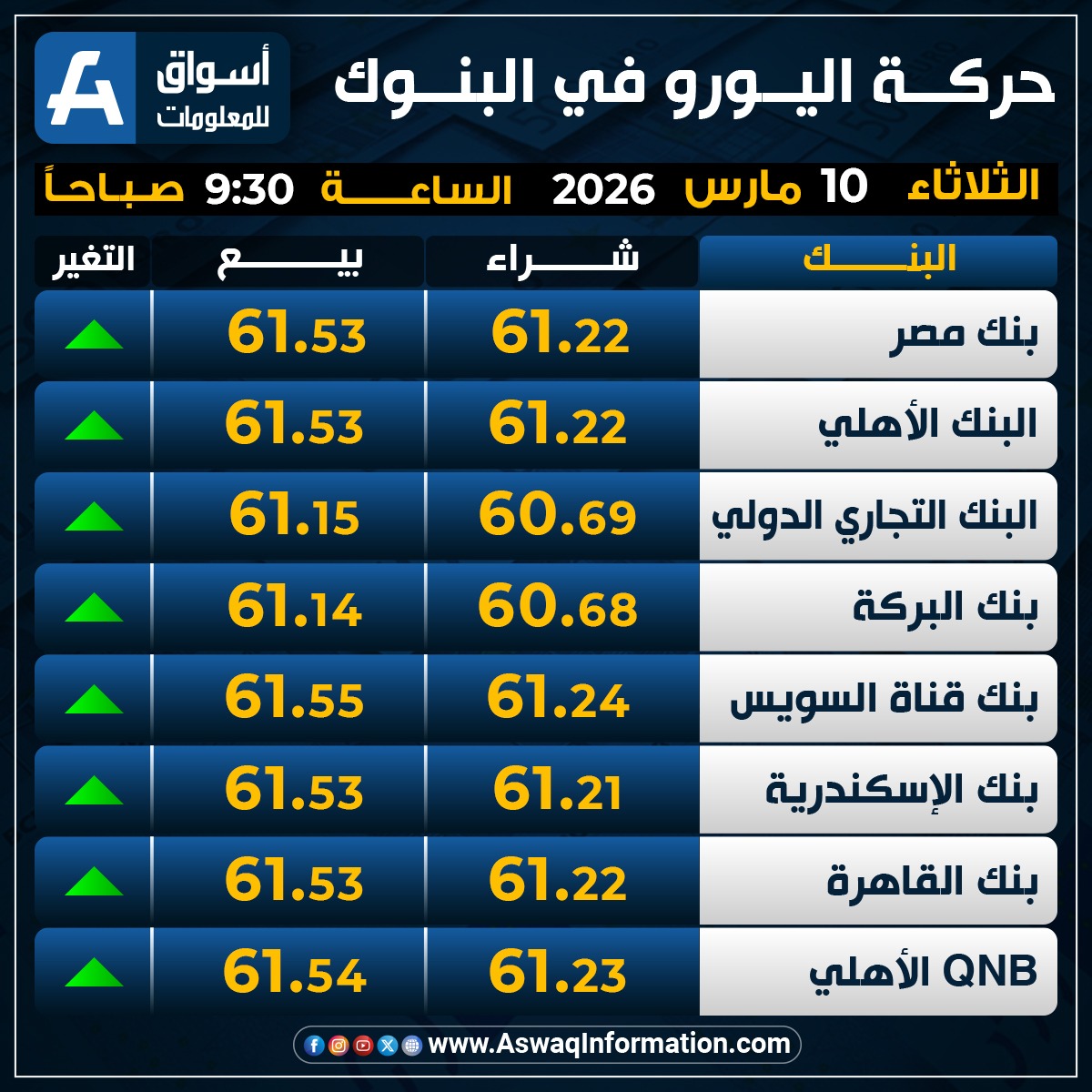 وصعد سعر اليورو في البنك الأهلي المصري نحو 61.22 جنيه للشراء، وسعر 61.53 جنيه للبيع