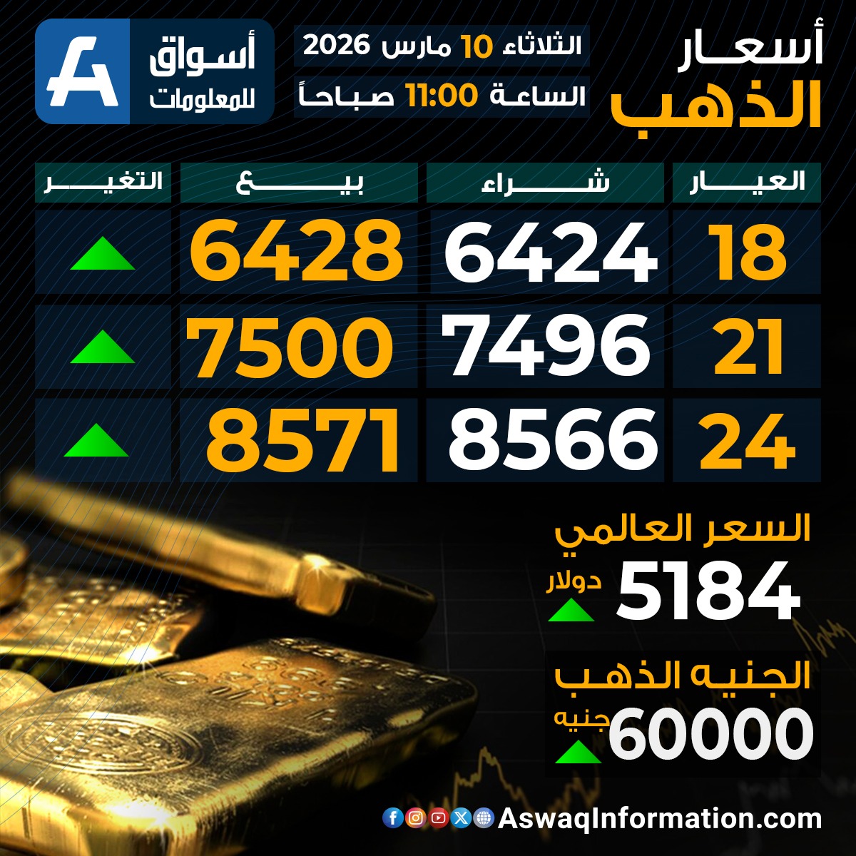 كما سجل سعر الذهب العالمي اليوم ارتفاعًا عند 5184 دولارا.