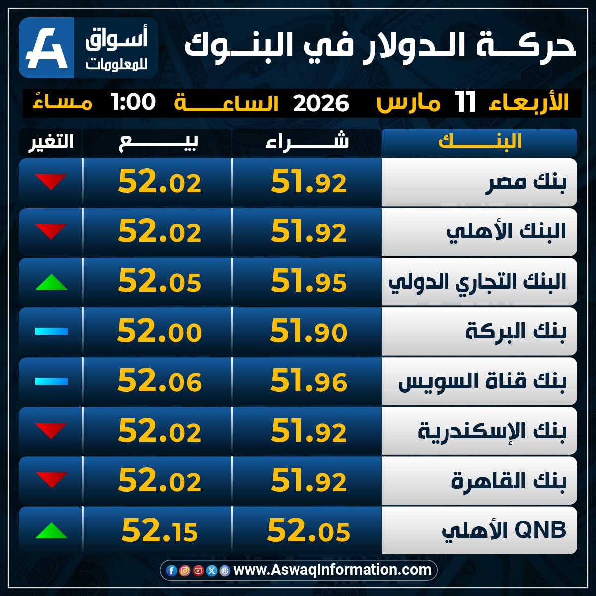 سعر الدولار اليوم.. ننشر لكم التفاصيل التي طرأت على العملة الخضراء التي شهدت تراجعًا بمنتصف تعاملات اليوم الأربعاء 11 مارس 2026 مقابل الجنيه، وذلك بحسب شاشات التداول المعلنة بالبنوك الحكومية والخاصة العاملة داخل السوق المصرفية.