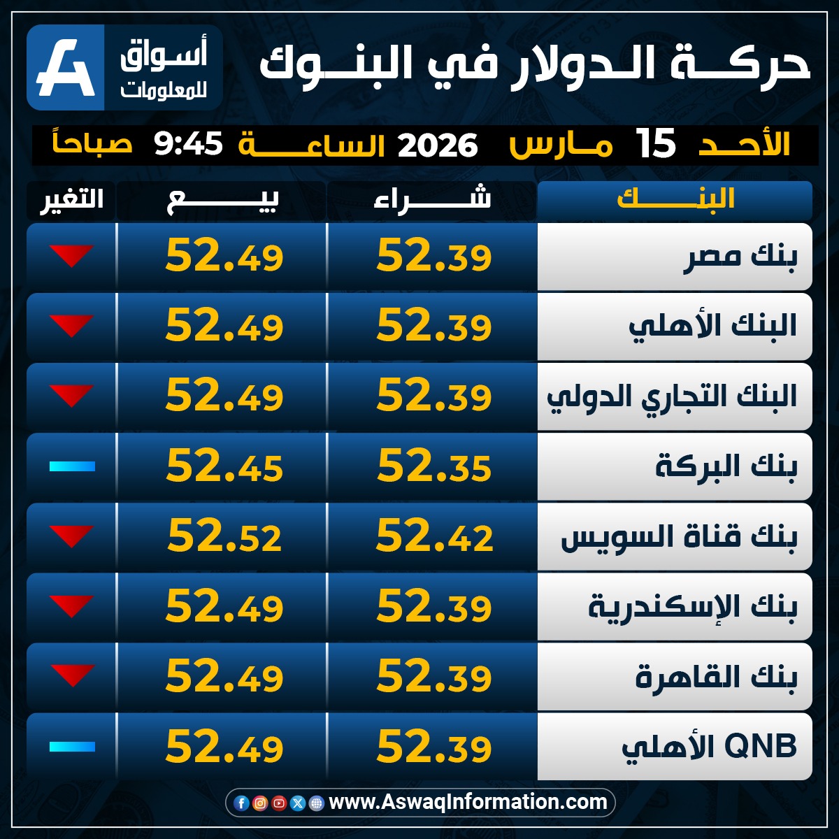 بينما استقر سعر الدولار في بنك QNB الأهلي مقابل الجنيه المصري عند 52.39 جنيه للشراء، ونحو 52.49 جنيه للبيع.