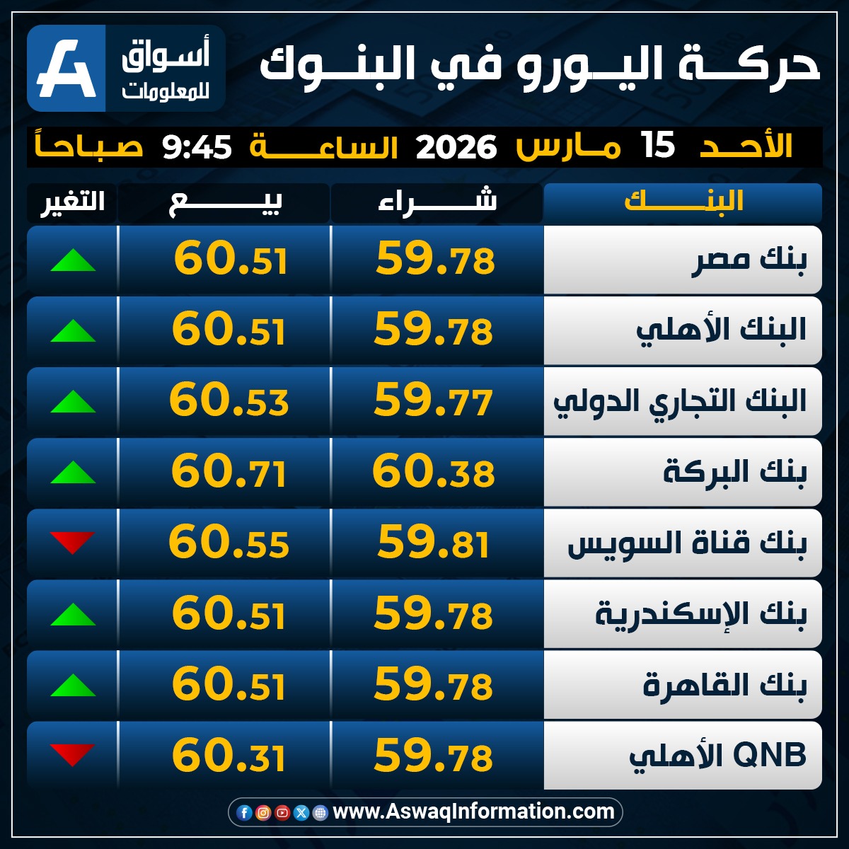 وصعد سعر اليورو في البنك الأهلي المصري نحو 59.78 جنيه للشراء، وسعر 60.51 جنيه للبيع