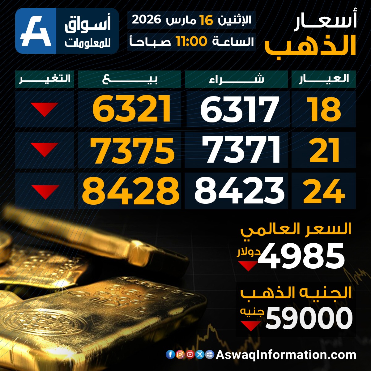 سجل سعر الجنيه الذهب اليوم الإثنين 16 مارس 2026 تراجعًا عند 59,000 جنيهًا ، قبل إضافة المصنعية والضريبة والدمغة.