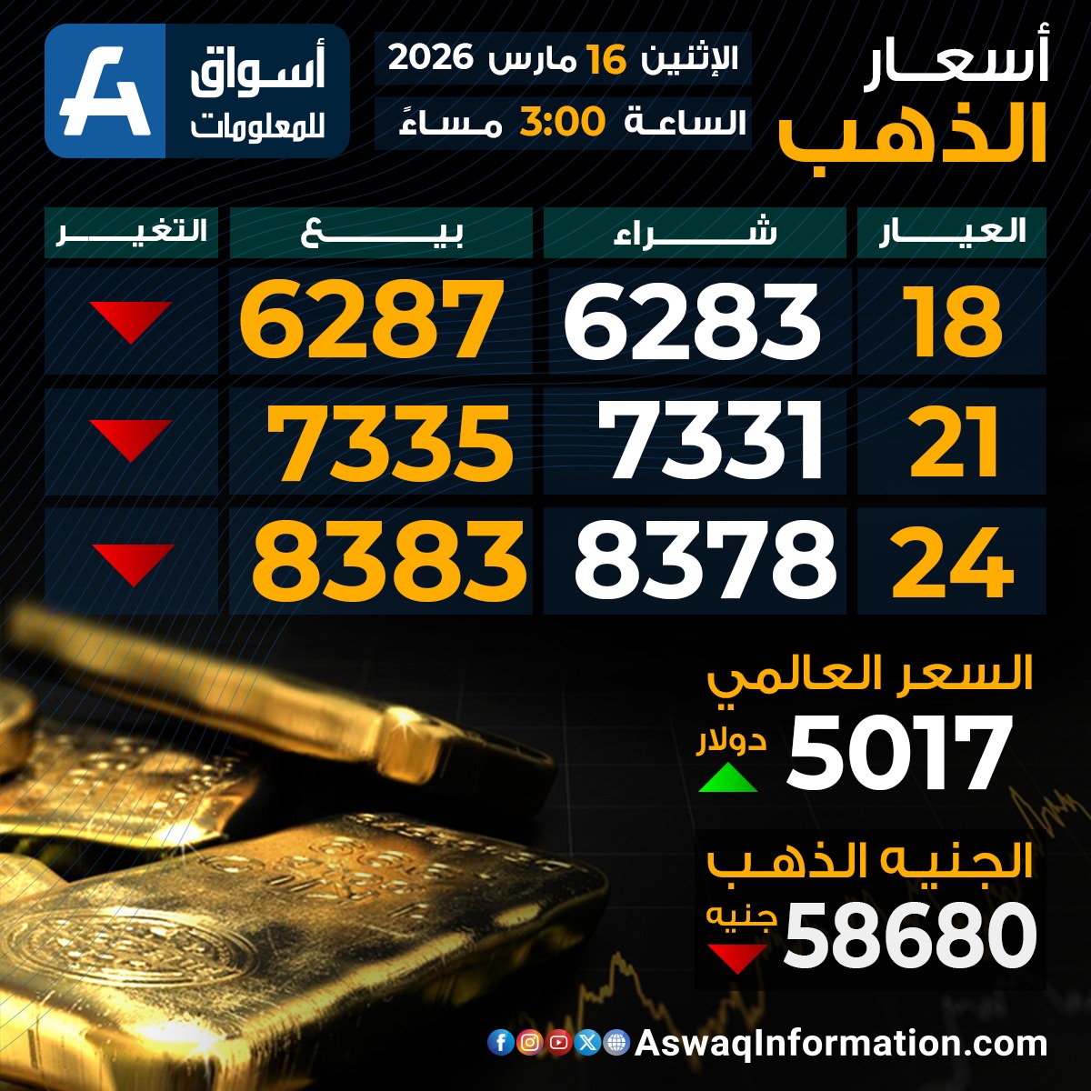 سعر الذهب في مصر الإثنين 16 مارس 2026