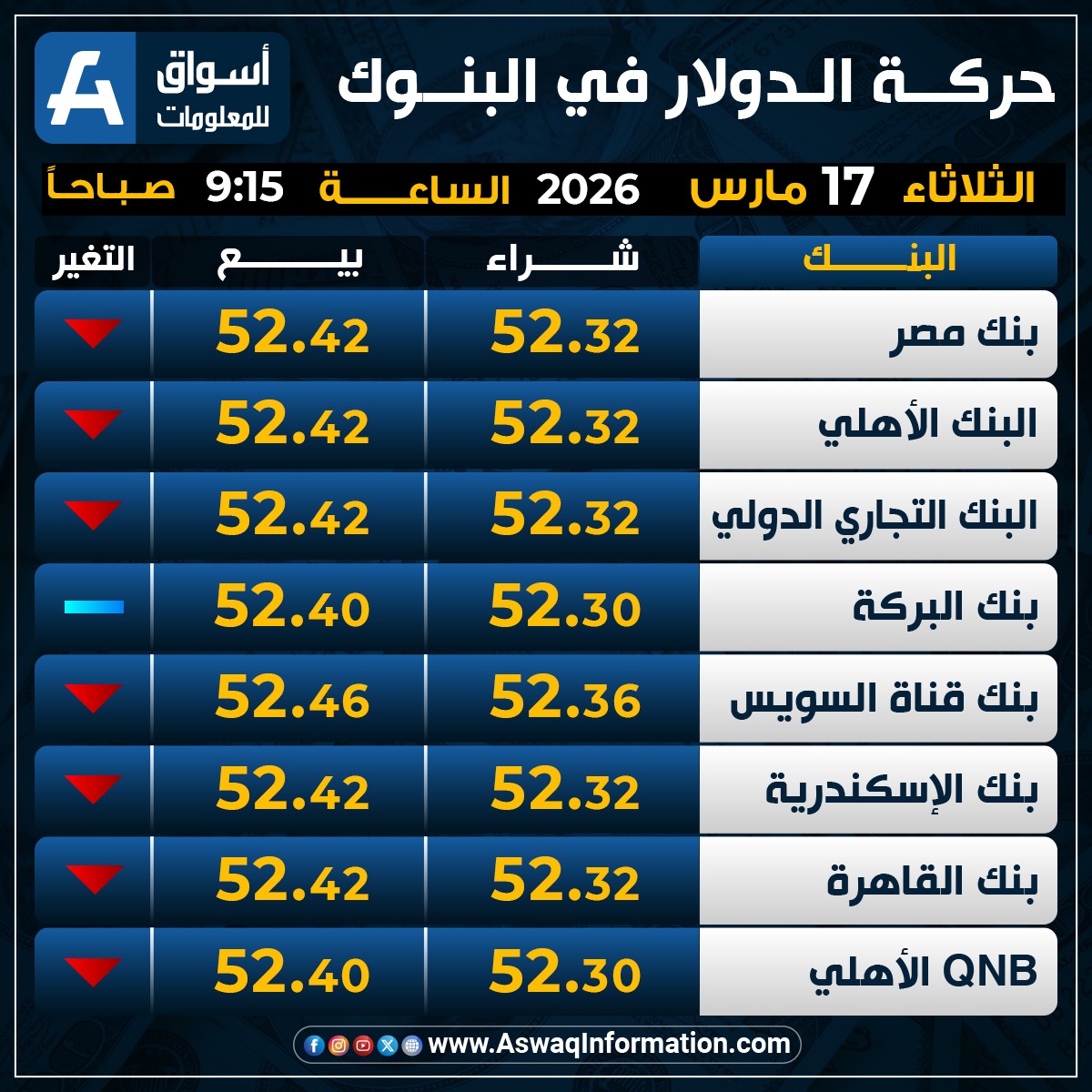 سعر الدولار اليوم.. ننشر لكم التفاصيل التي طرأت على العملة الخضراء التي شهدت تراجعًا بمستهل تعاملات اليوم الثلاثاء 17 مارس 2026 مقابل الجنيه، وذلك بحسب شاشات التداول المعلنة بالبنوك الحكومية والخاصة العاملة داخل السوق المصرفية.