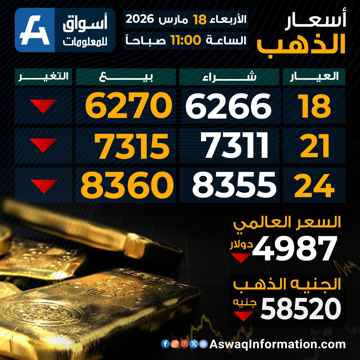 سعر الذهب في مصر الأربعاء 18 مارس 2026