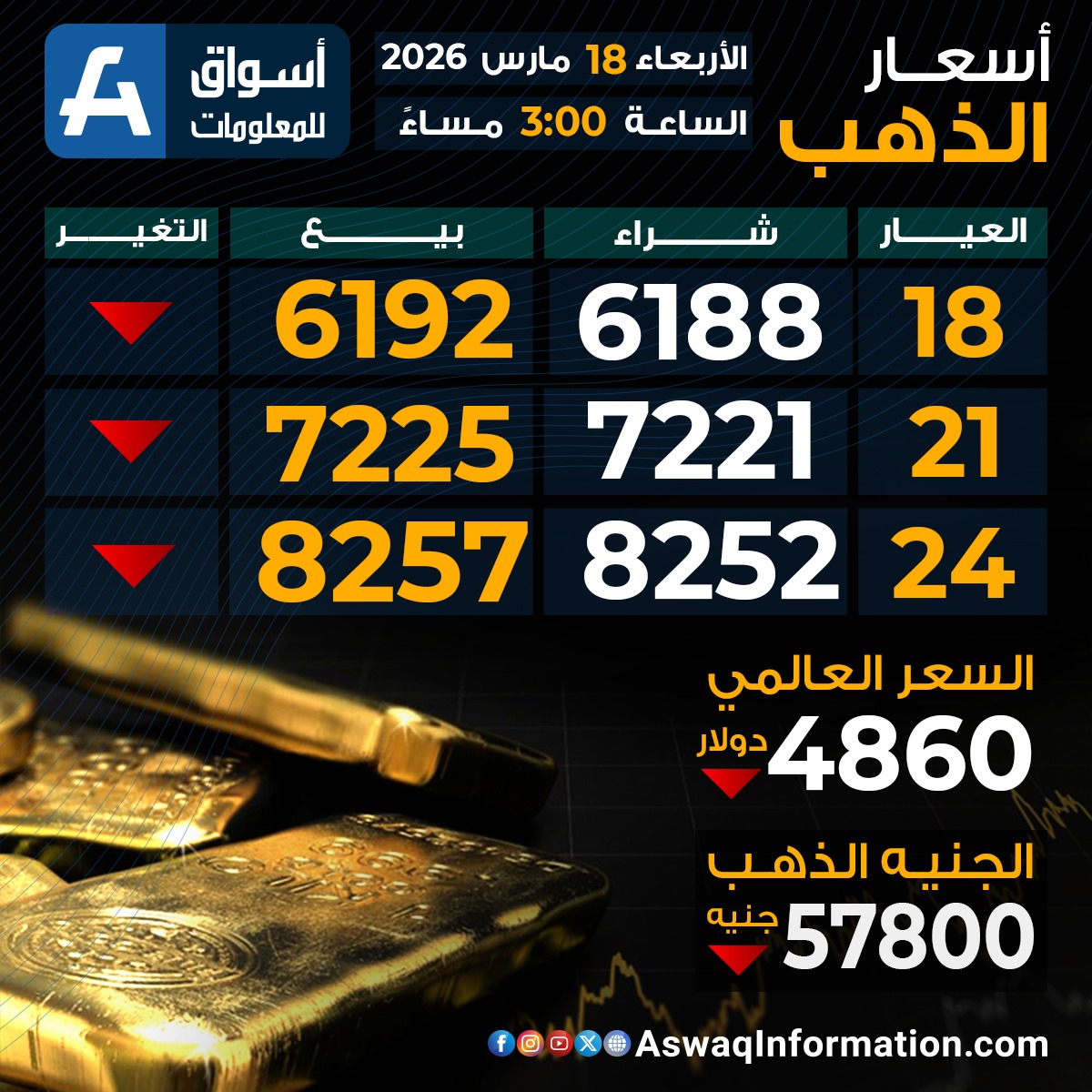 سعر الذهب في مصر الأربعاء 18 مارس 2026
