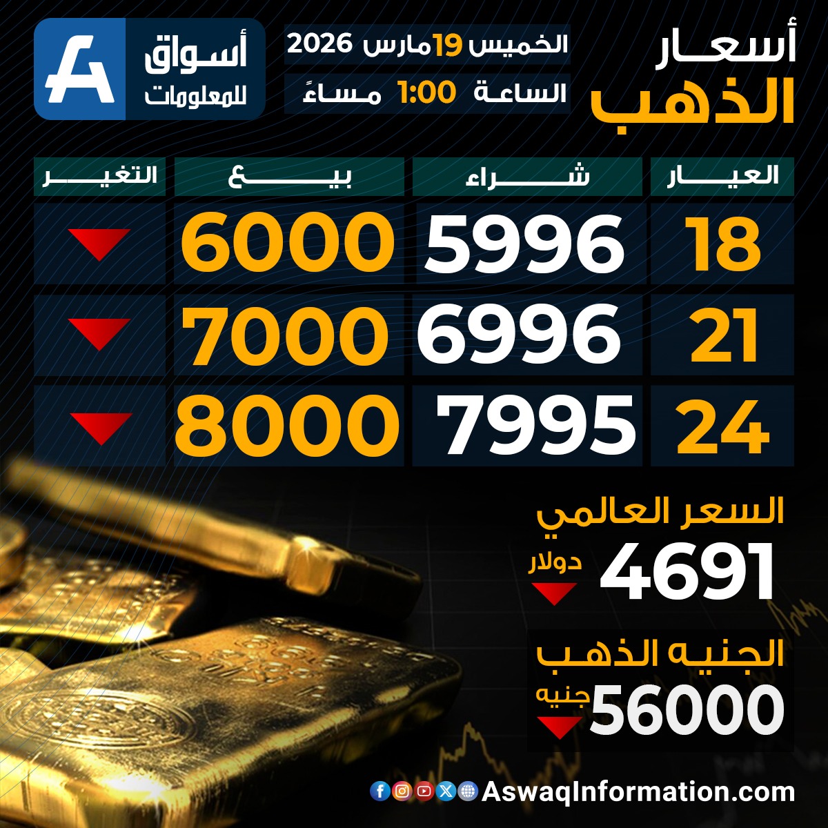سجل سعر الجنيه الذهب اليوم الخميس 19 مارس 2026 تراجعًا عند 56,000 جنيهًا ، قبل إضافة المصنعية والضريبة والدمغة.