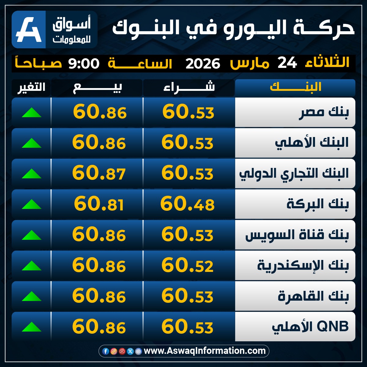 وصعد سعر اليورو في البنك الأهلي المصري نحو 60.53 جنيه للشراء، وسعر 60.86 جنيه للبيع