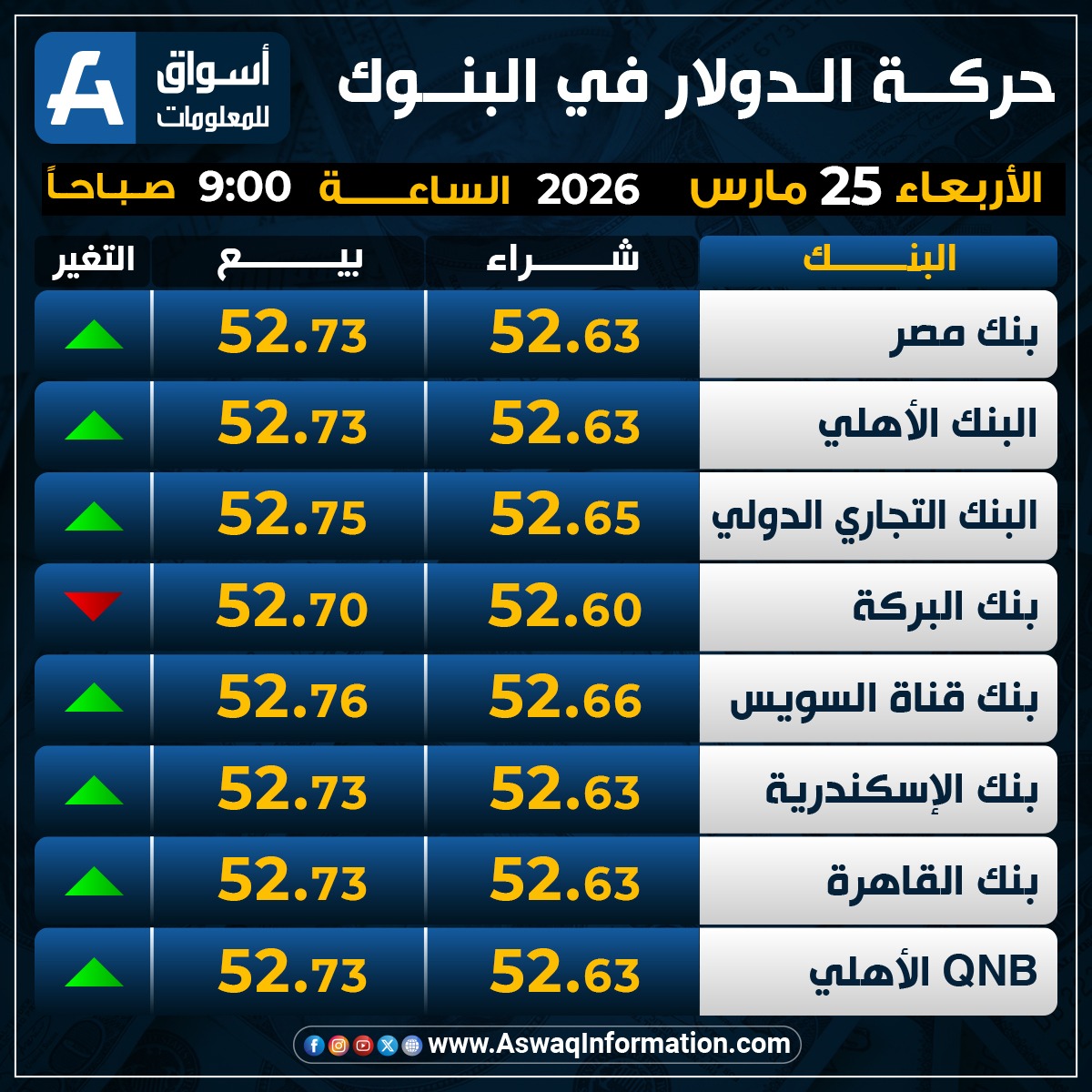 وصعد سعر الدولار في البنك الأهلي المصري مقابل الجنيه المصري عند 52.63 جنيه للشراء، ونحو 52.73 جنيه للبيع.
