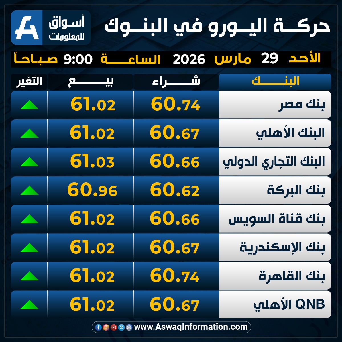 وصعد سعر اليورو في البنك الأهلي المصري نحو 60.67 جنيه للشراء، وسعر 61.02 جنيه للبيع