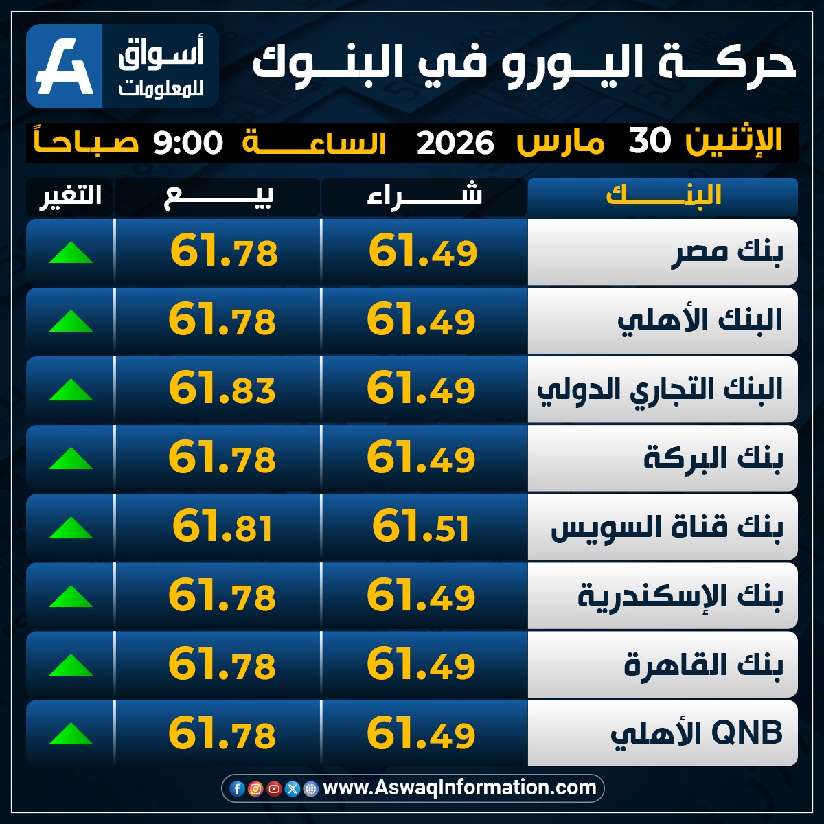 وقفز سعر اليورو في البنك عند 61.49 جنيه للشراء، وسعر 61.78 جنيه للبيع