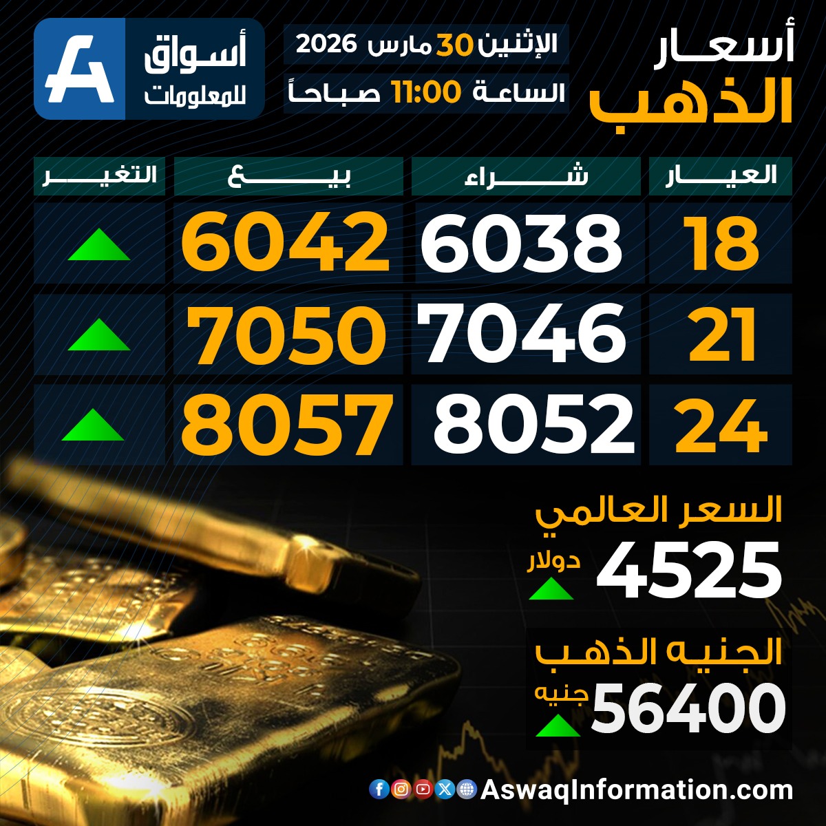 سجل سعر الجنيه الذهب اليوم الإثنين 30 مارس 2026 ارتفاعًا عند 56.400 جنيهًا ، قبل إضافة المصنعية والضريبة والدمغة.