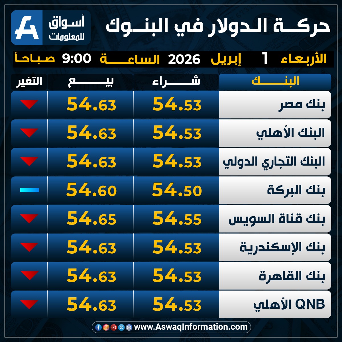 سعر الدولار اليوم.. ننشر لكم التفاصيل التي طرأت على العملة الخضراء التي شهدت تراجعًا بمستهل تعاملات اليوم الأربعاء 1 أبريل 2026 مقابل الجنيه، وذلك بحسب شاشات التداول المعلنة بالبنوك الحكومية والخاصة العاملة داخل السوق المصرفية.