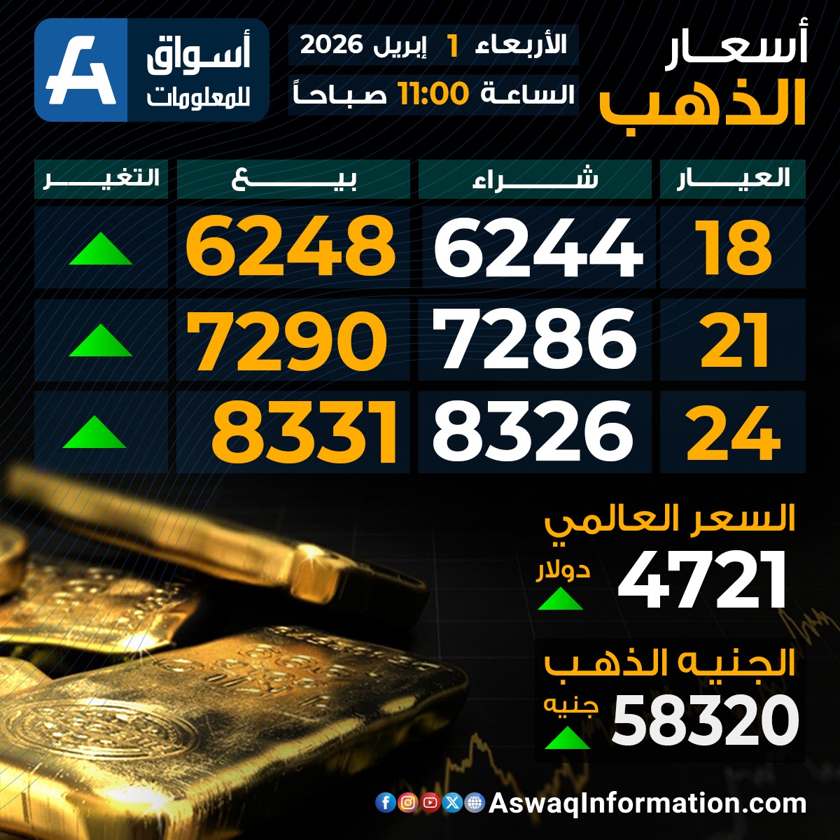 سجل سعر الجنيه الذهب اليوم الأربعاء 1 أبريل 2026 ارتفاعًا عند 58.320 جنيهًا ، قبل إضافة المصنعية والضريبة والدمغة.
