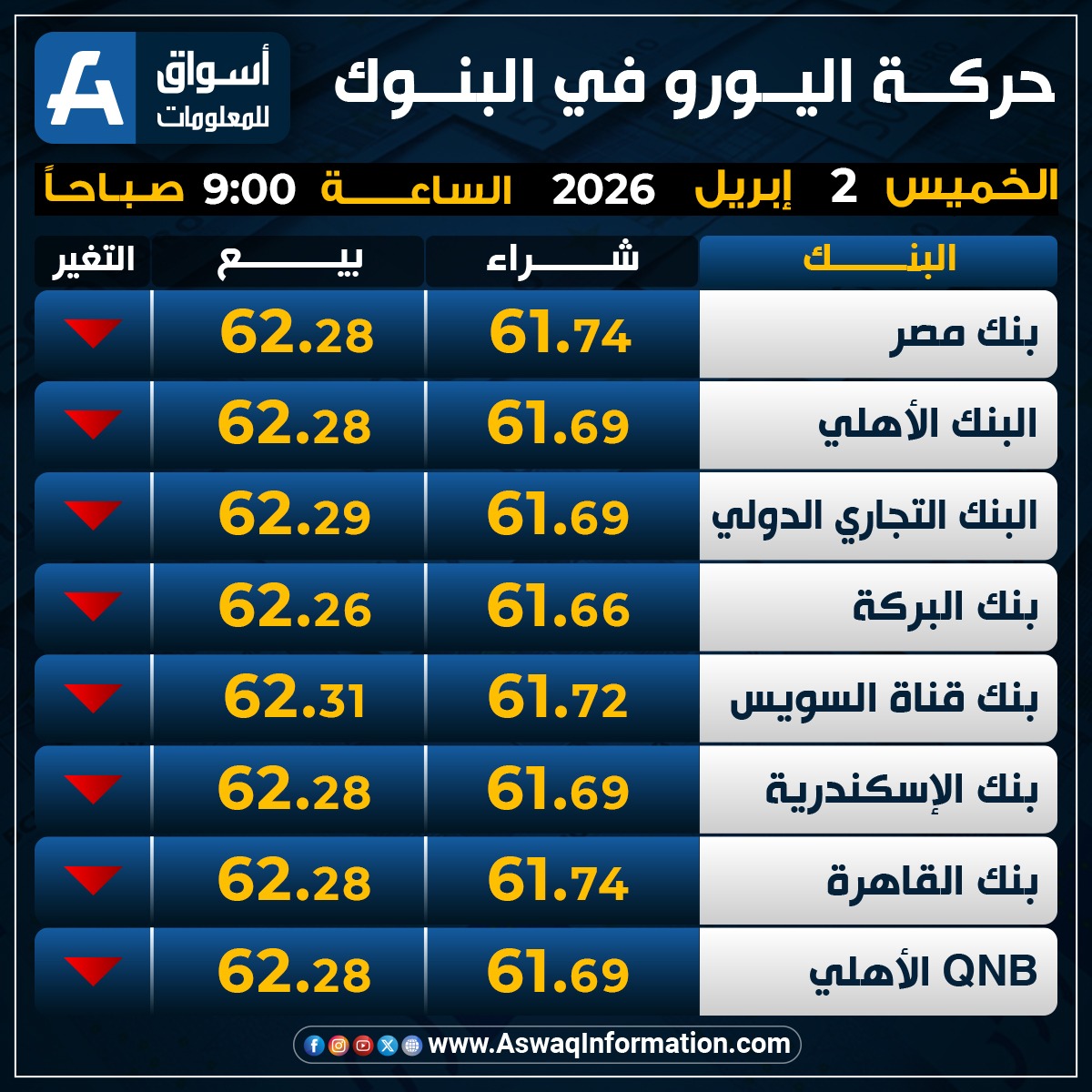 وانخفض سعر اليورو في البنك الأهلي المصري نحو 61.69 جنيه للشراء، وسعر 62.28 جنيه للبيع