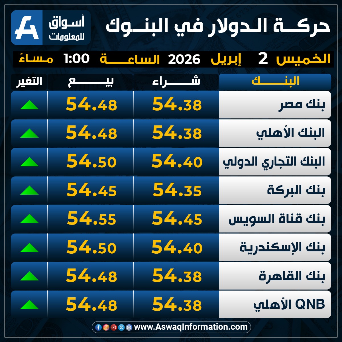 وصعد سعر الدولار في البنك الأهلي المصري مقابل الجنيه المصري عند 54.38 جنيه للشراء، ونحو 54.48 جنيه للبيع.