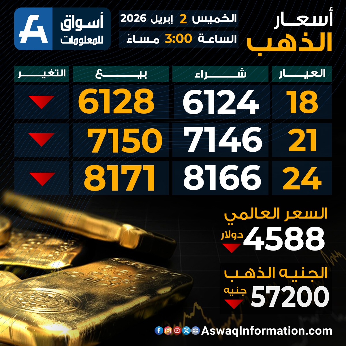 كما سجل سعر الذهب العالمي اليوم تراجعًا عند 4588 دولارا.