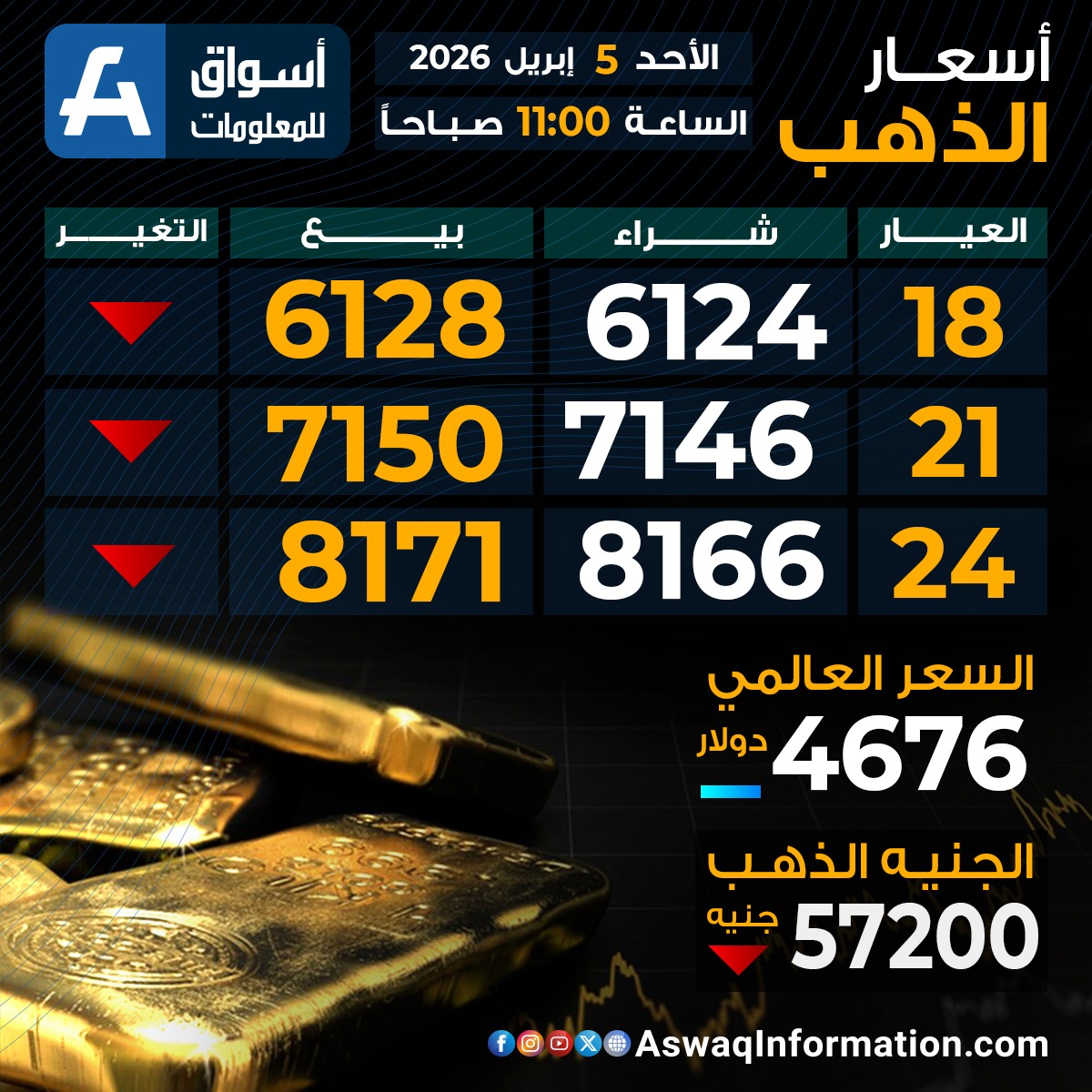 سجل سعر الجنيه الذهب اليوم الأحد 5 أبريل 2026 تراجعًا عند 57.200 جنيهًا ، قبل إضافة المصنعية والضريبة والدمغة.