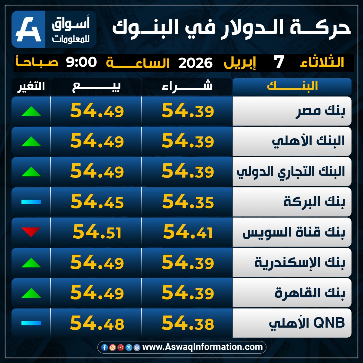 سعر الدولار اليوم.. ننشر لكم التفاصيل التي طرأت على العملة الخضراء التي شهدت تباينًا بمستهل تعاملات اليوم الثلاثاء 7 أبريل 2026 مقابل الجنيه، وذلك بحسب شاشات التداول المعلنة بالبنوك الحكومية والخاصة العاملة داخل السوق المصرفية.