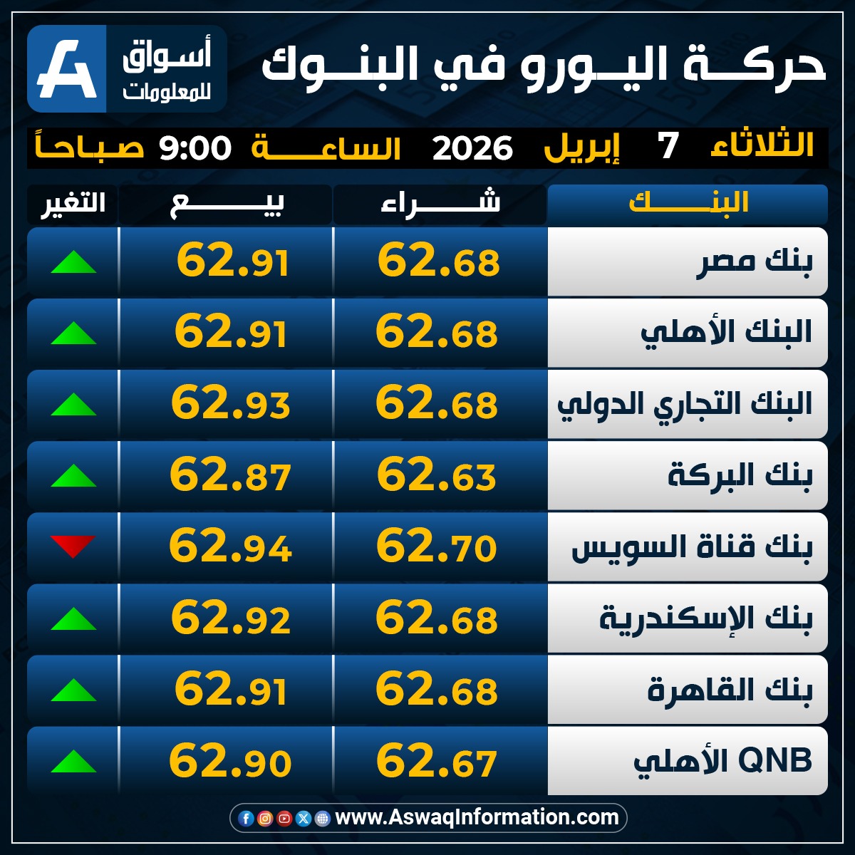 وصعد سعر اليورو في البنك الأهلي المصري نحو 62.68 جنيه للشراء، وسعر 62.91 جنيه للبيع
