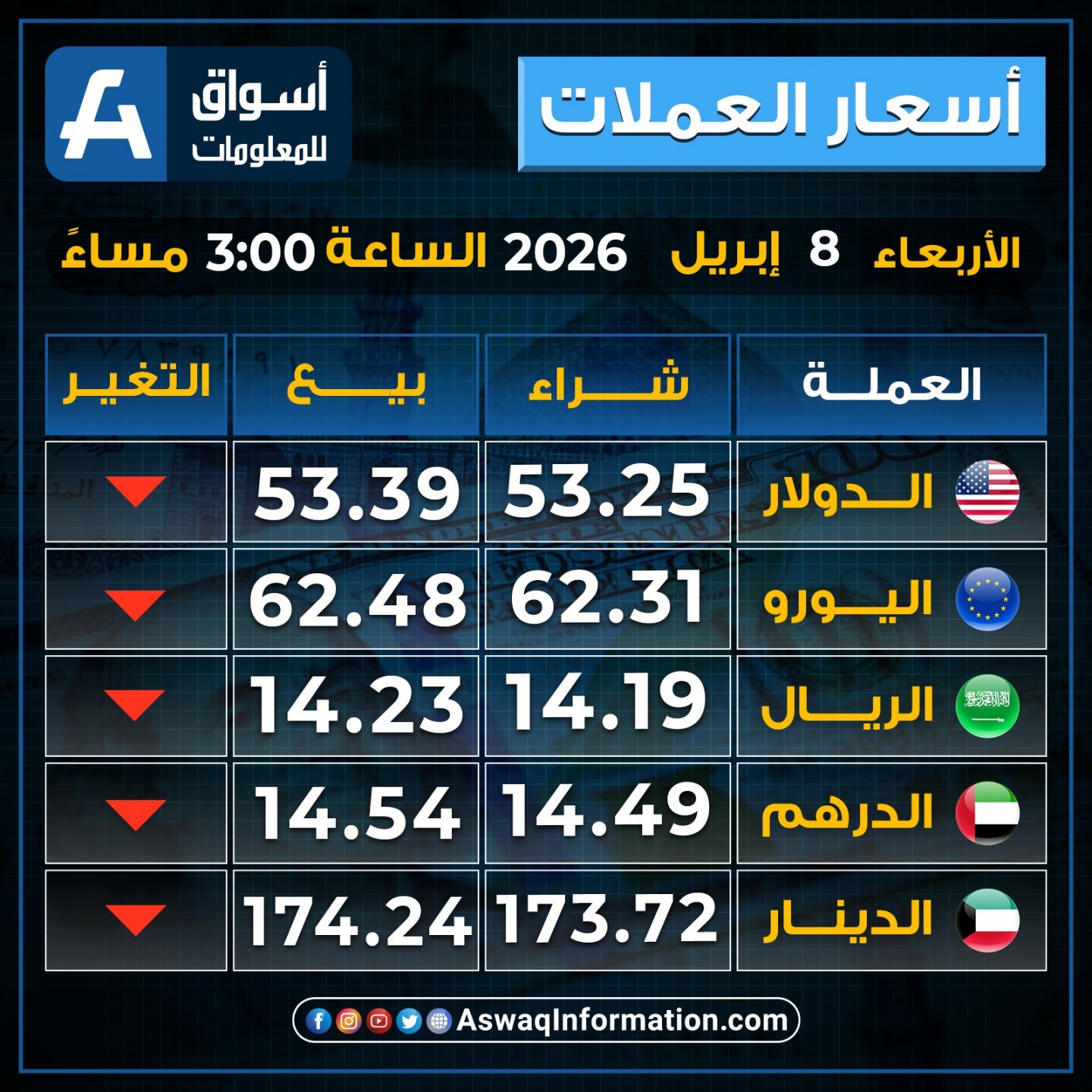 خيم التراجع على أسعار العملات اليوم الأربعاء 8 أبريل 2026، مقابل الجنيه في نهاية التعاملات.