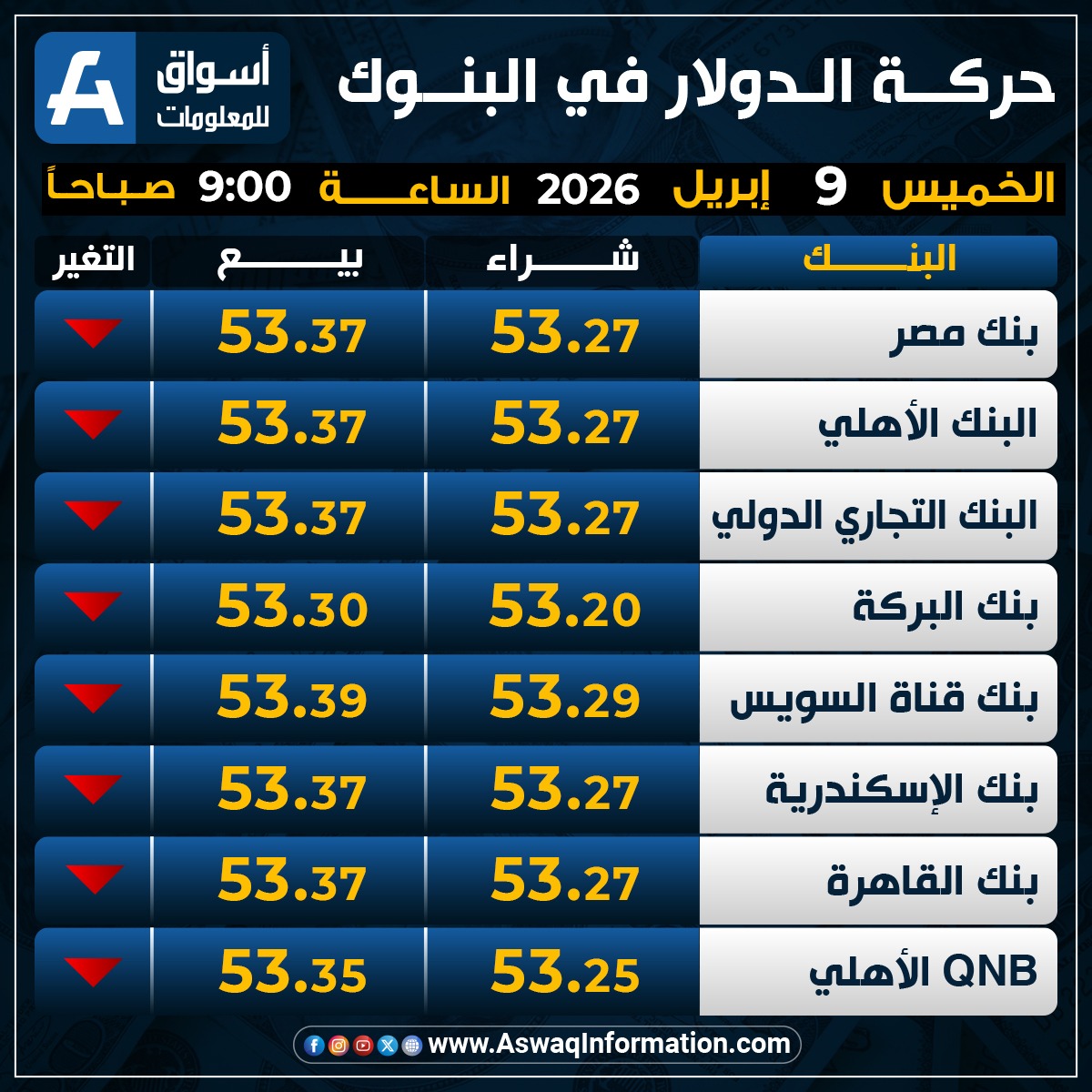 سعر الدولار اليوم.. ننشر لكم التفاصيل التي طرأت على العملة الخضراء التي شهدت تراجعًا بمستهل تعاملات اليوم الخميس 9 أبريل 2026 مقابل الجنيه، وذلك بحسب شاشات التداول المعلنة بالبنوك الحكومية والخاصة العاملة داخل السوق المصرفية.