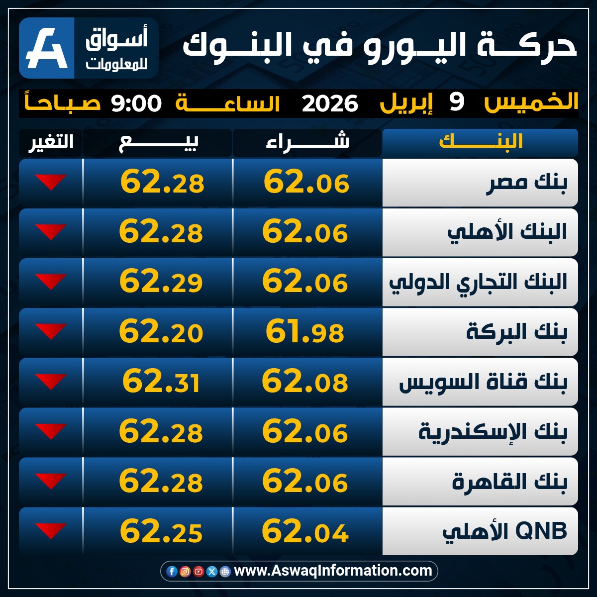 ونزل سعر اليورو في البنك عند 61.98 جنيه للشراء، وسعر 62.20 جنيه للبيع