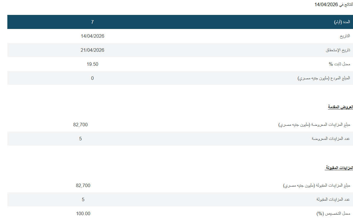 وتقدم للعطاء، 5 بنوكًا، قبلت طلباتها جميعًا، وسيكون تاريخ استحقاقها 21 أبريل الجاري، بحسب البيانات المنشورة عبر الموقع الرسمي للبنك.