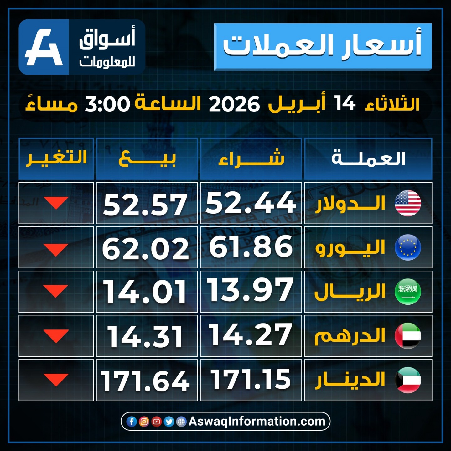 خيم التراجع على أسعار العملات اليوم الثلاثاء 14 أبريل 2026، مقابل الجنيه في نهاية التعاملات.