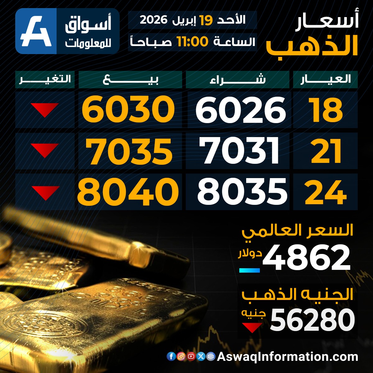 سجل سعر الجنيه الذهب اليوم الأحد 19 أبريل 2026 تراجعًا عند 56.280 جنيهًا ، قبل إضافة المصنعية والضريبة والدمغة.