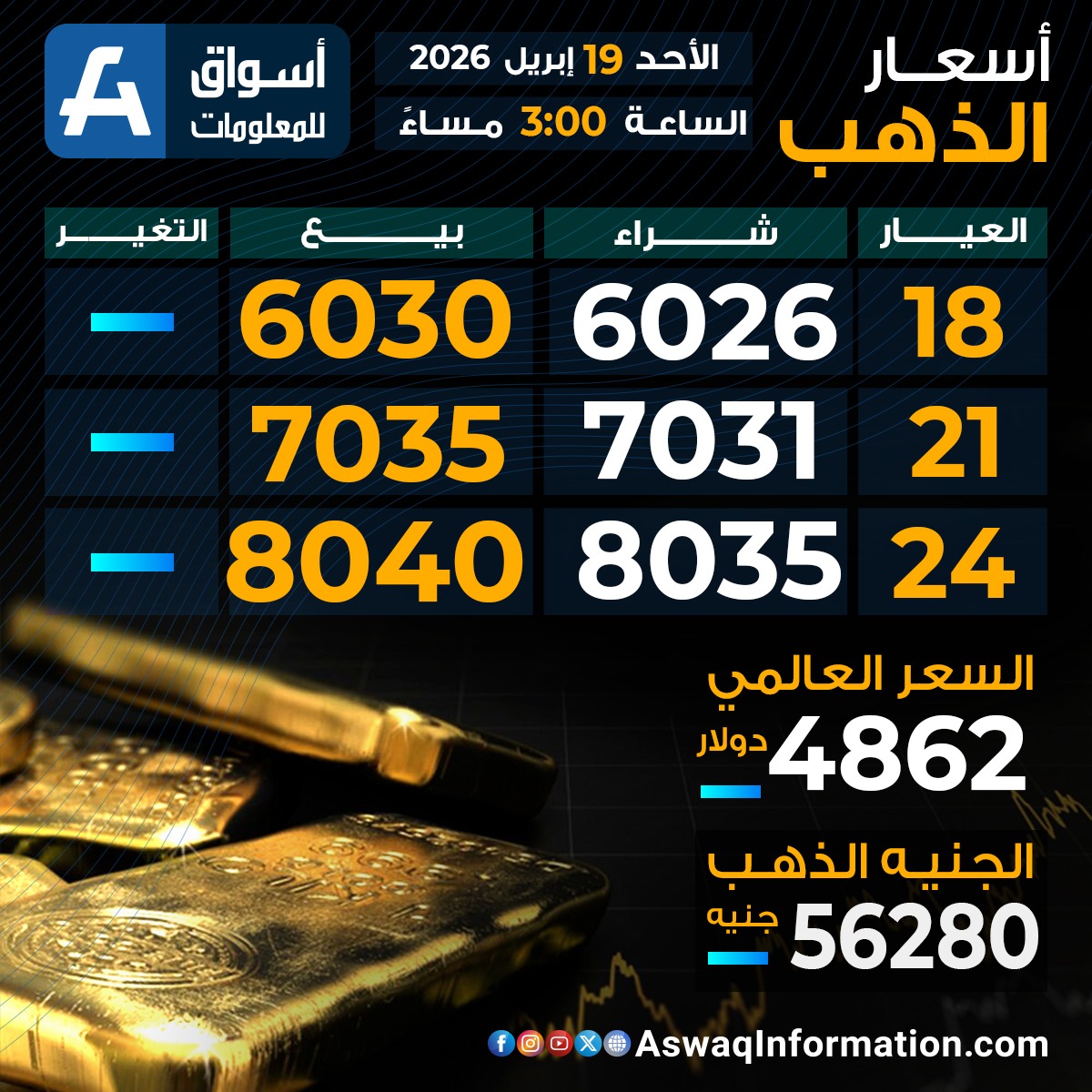 سجل سعر الجنيه الذهب اليوم الأحد 19 أبريل 2026 استقرارًا عند 56,280 جنيهًا ، قبل إضافة المصنعية والضريبة والدمغة.