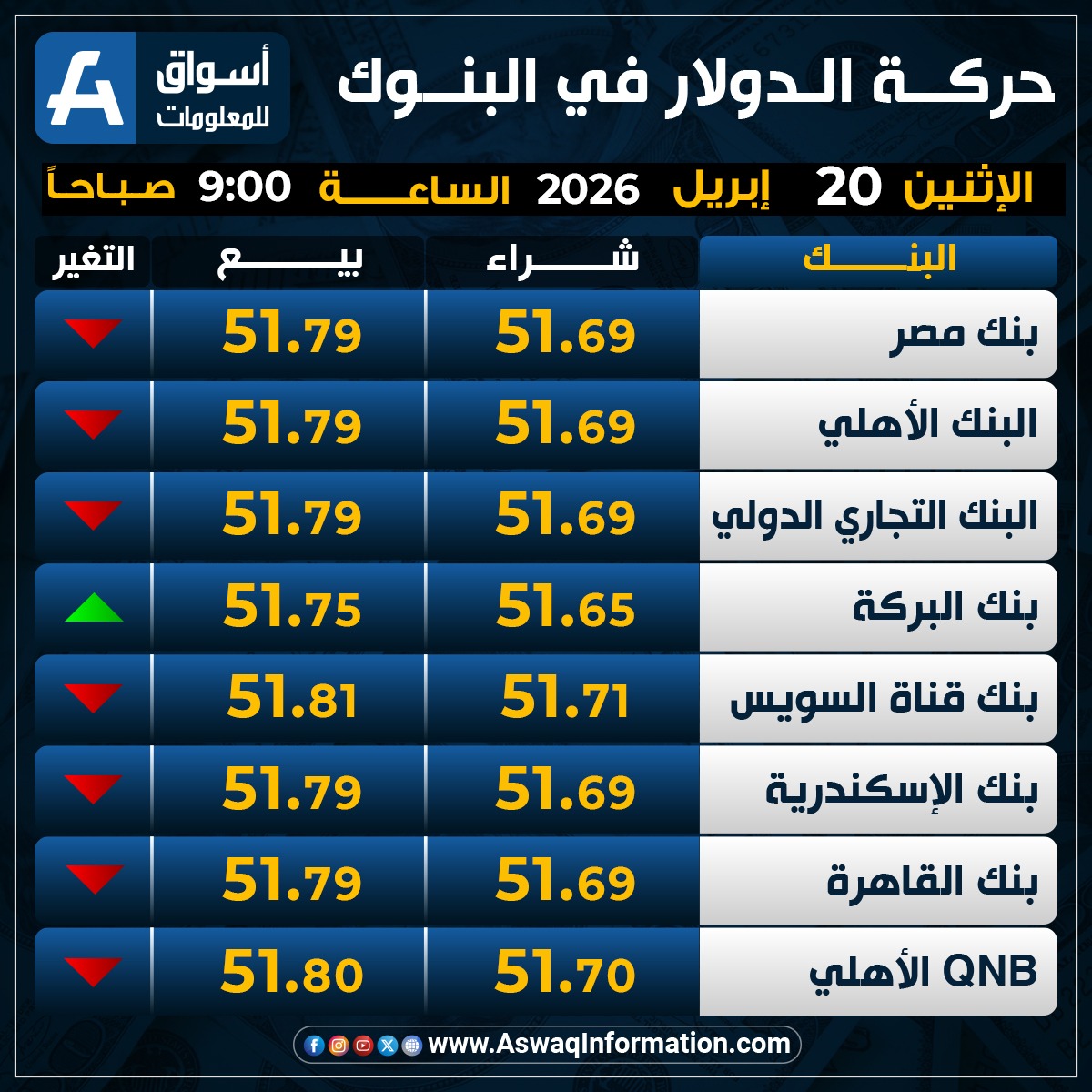 وهبط سعر الدولار في البنك الأهلي المصري مقابل الجنيه المصري عند 51.69 جنيه للشراء، ونحو 51.79 جنيه للبيع.