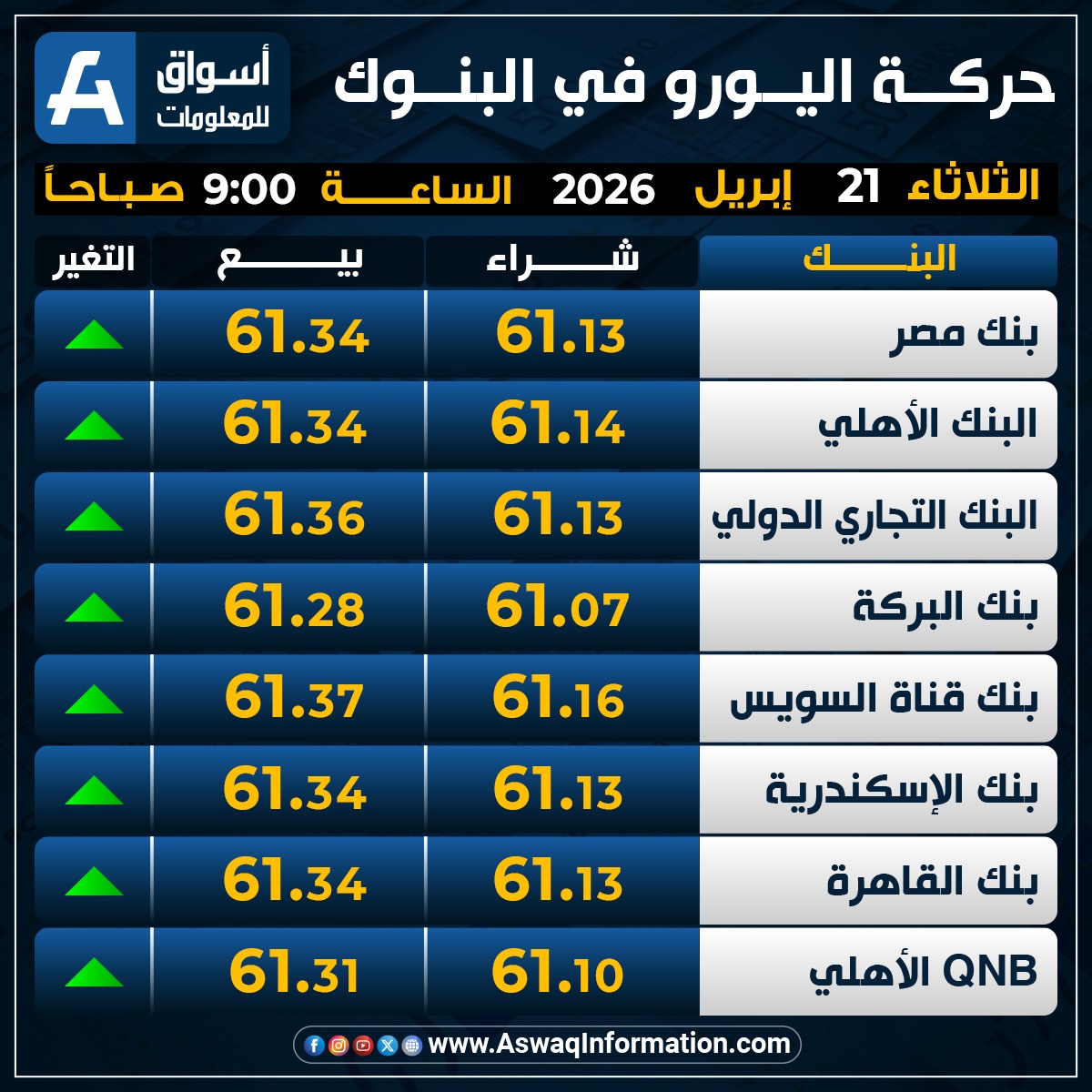 وزاد سعر اليورو في البنك عند 61.07 جنيه للشراء، وسعر 61.28 جنيه للبيع